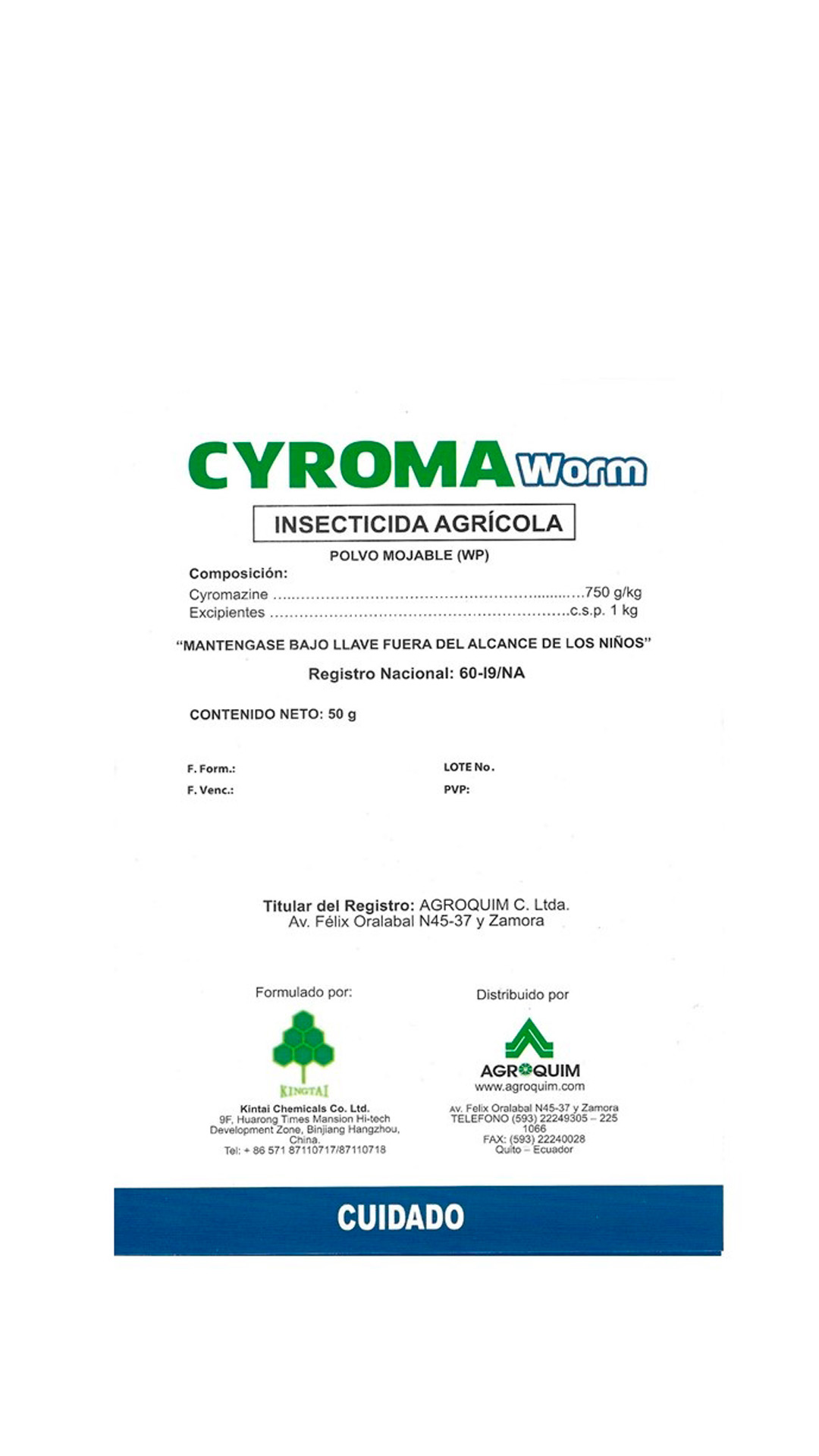 Insecticida sistémico y translaminar. Polvo mojable que contiene 750 gramos de ingrediente activo (Ciromazina) por kg de producto comercial regulador de crecimiento, de alto control efectivo de larvas minadoras pertenecientes al género Liriomyza.
