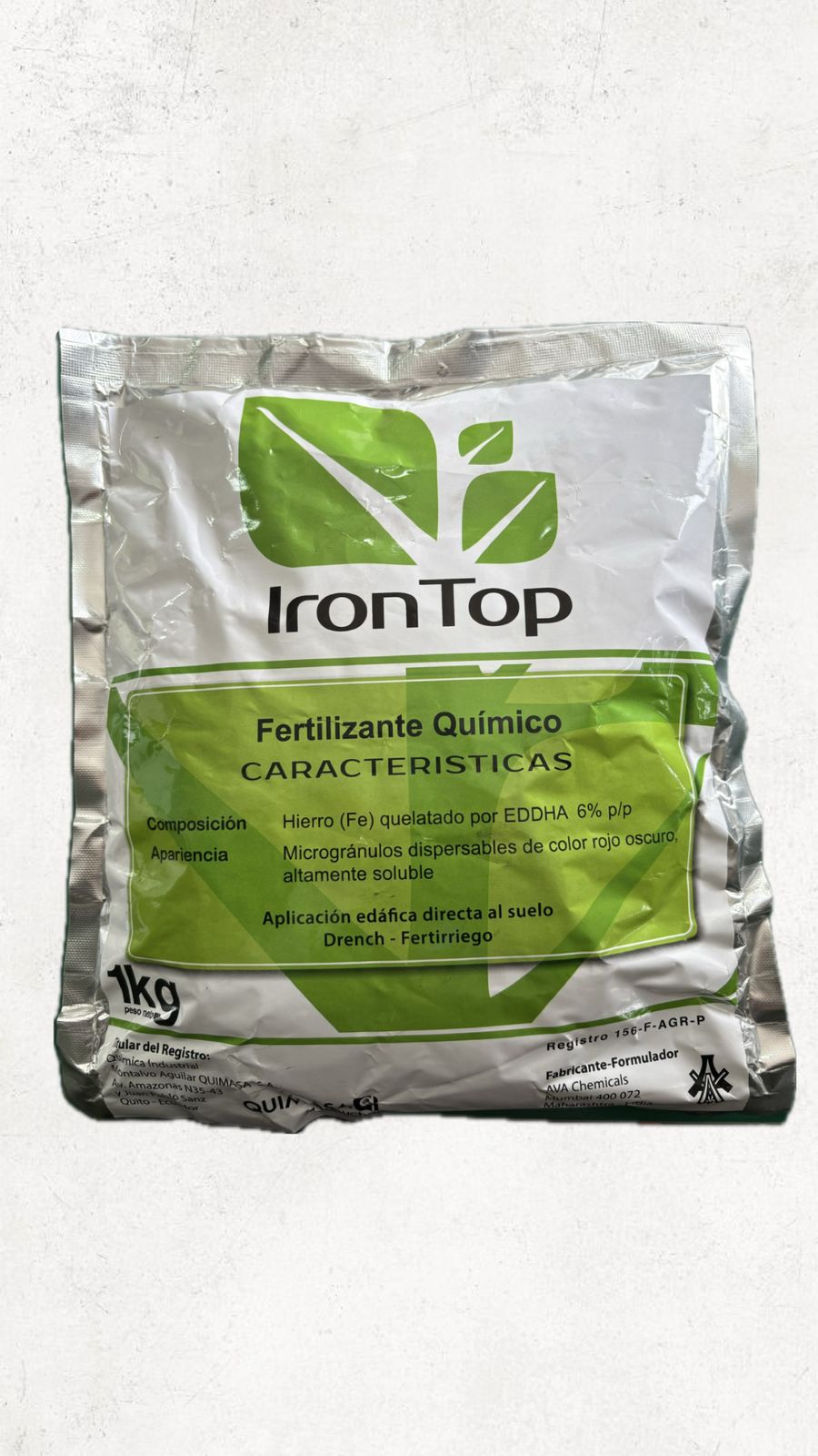 IronTop es un fertilizante químico a base de hierro quelatado con EDDHA, altamente soluble y de color rojo oscuro. Está diseñado para aplicación edáfica directa al suelo, drench o fertirriego. Su formulación asegura una rápida y eficiente asimilación del hierro por las raíces, corrigiendo deficiencias y promoviendo un crecimiento vigoroso y un follaje verde intenso en las plantas.