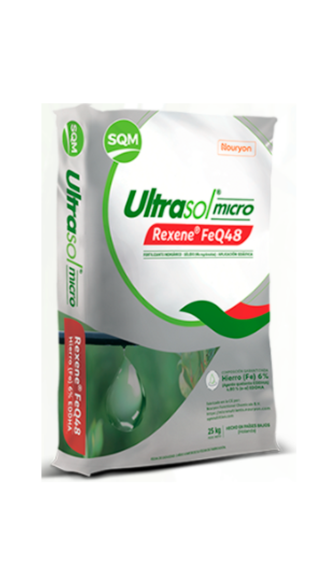 Ultrasol® micro Rexene® FeQ48 tiene 4,8% (48 gramos) de Hierro en posición orto-orto de 6 % (60 gramos) de hierro por kilo de producto quelatado como Fe-EDDHA.
