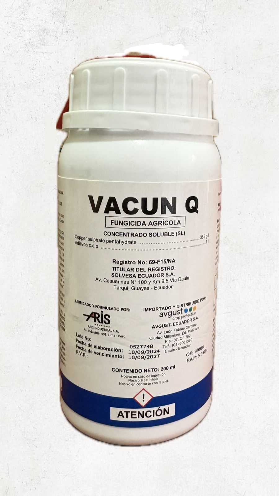 Vacun Q es un fungicida agrícola concentrado soluble a base de sulfato de cobre pentahidratado. Actúa por contacto, inhibiendo el desarrollo de diversos hongos patógenos en diferentes cultivos. Se utiliza para la prevención y el control de enfermedades fúngicas, contribuyendo a mantener la sanidad vegetal.